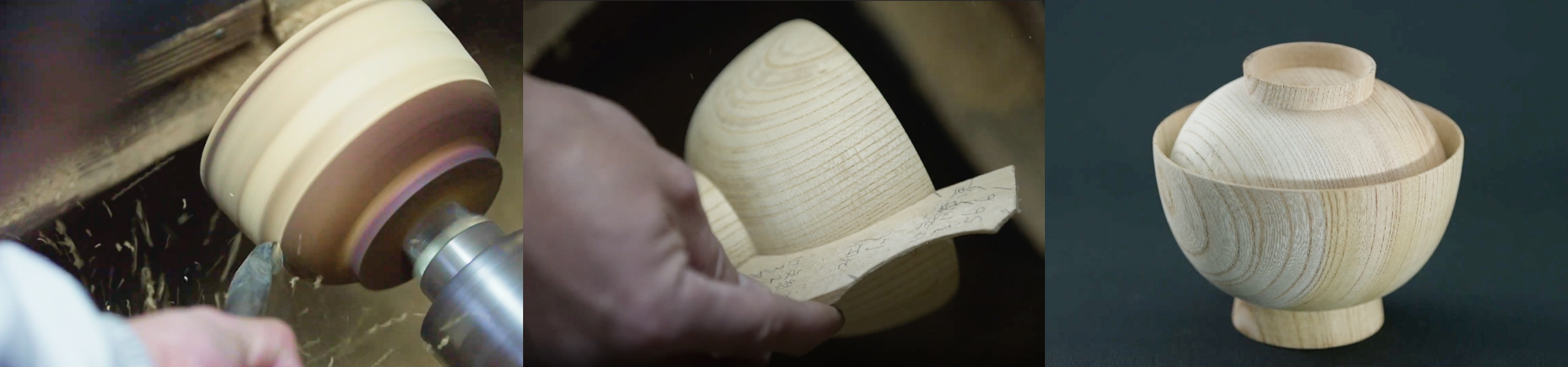 The wood for bowls is called Wan-Kiji, and there are also Sashimono-Kiji (stacked boxes, inkstone boxes, dishes, square trays, etc.), Magemono-Kiji (round trays, lunch boxes, etc.), and Hou-Kiji (legs for tables and flower stands, mouths for choshi (sake decanter), spoons, etc.). This is a process that requires a high level of skill.