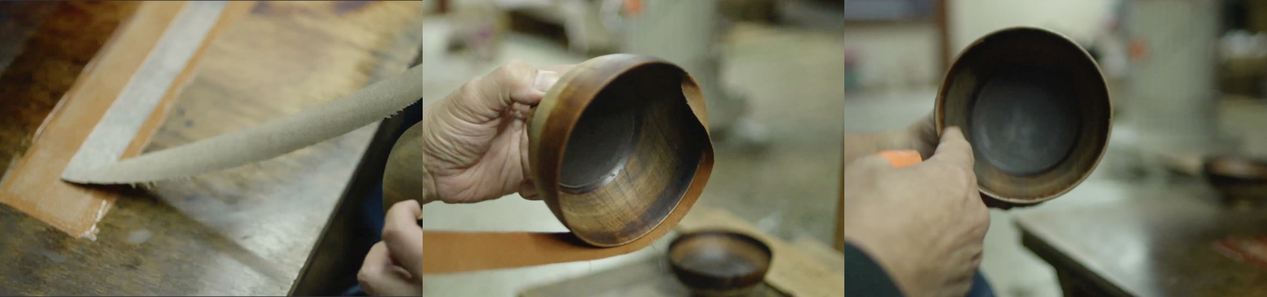 After drying, they are manually cut into the actual shape of the bowl using a plane and a potter's wheel.
