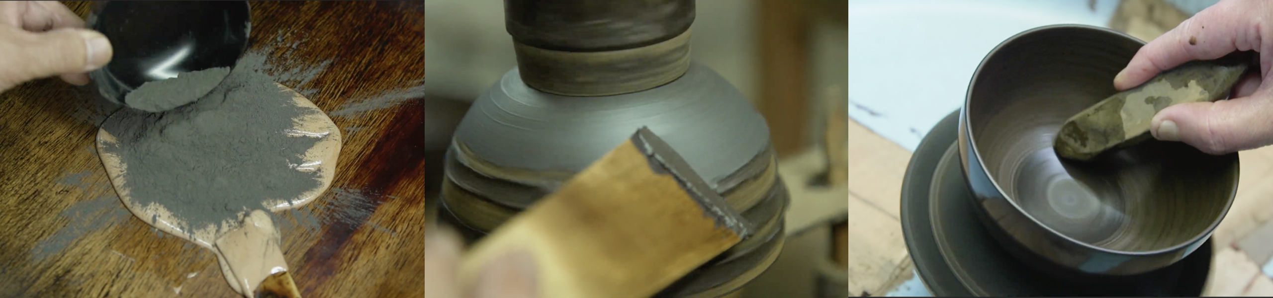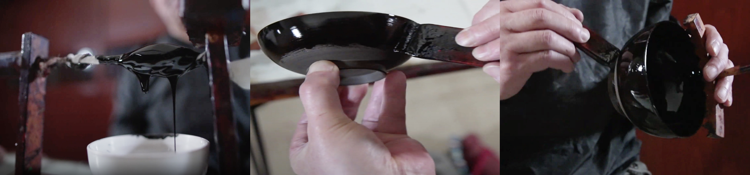The base lacquer is made by baking local diatomaceous earth "jinoko" into a powdered form and mixing it with raw lacquer.