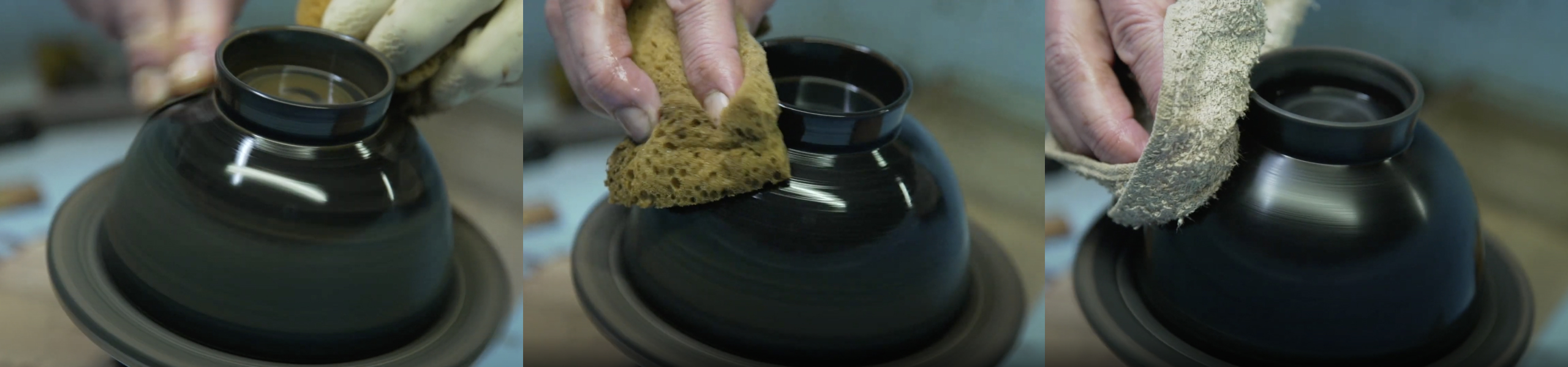 After drying, the edges are polished with shark skin, and the whole surface is polished with sandpaper. Then, the process called "Nuno-kise" is performed, in which linen is pasted on the rim and bottom of the bowl, which are easily damaged, using a mixture of raw lacquer and rice glue.