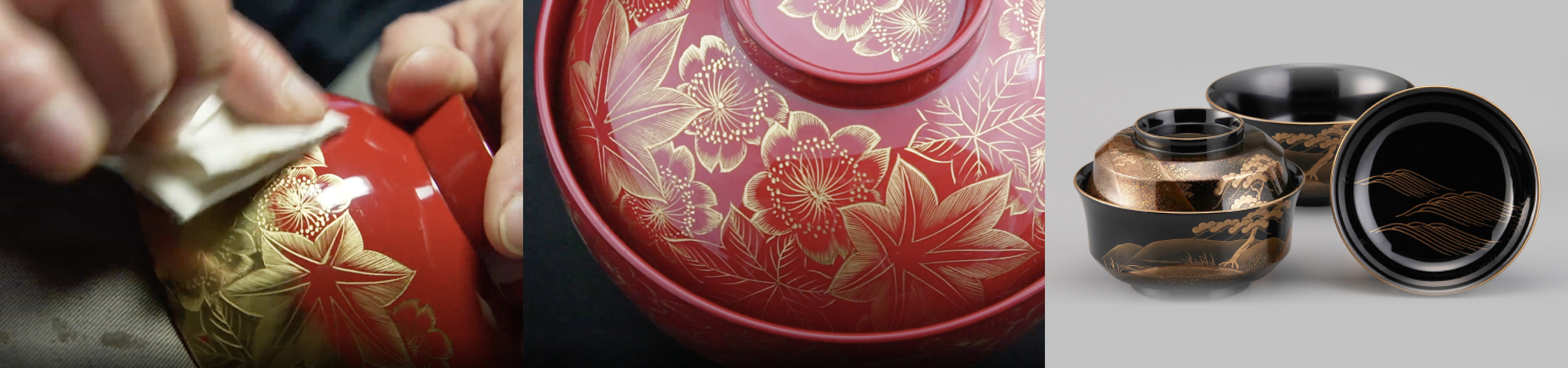 After the Wajima-nuri is completed in this way, gold decoration called maki-e (Gold lacquer) or chinkin (Gold-inlay) is applied depending on the design.