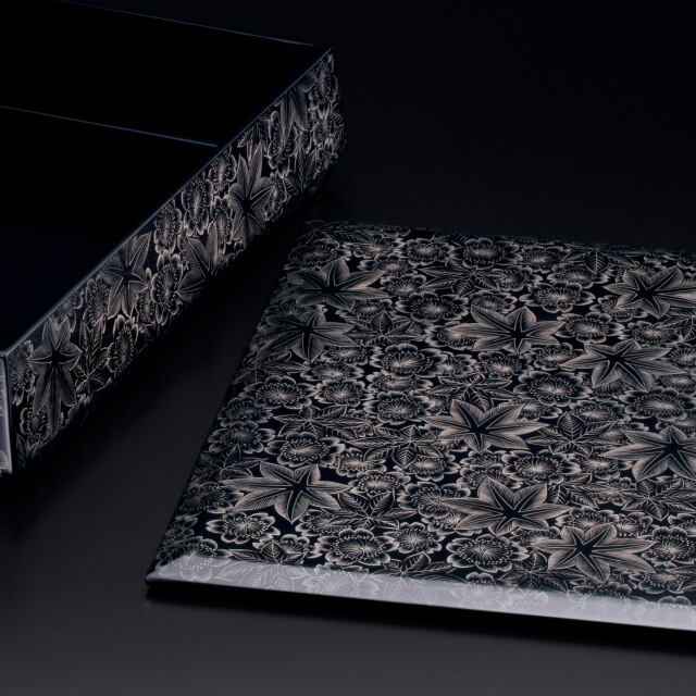 The skills of the lacquerer and the maki-e artist are interwoven to create a modern Wajima-nuri version of the ukiyoe of the Edo period.