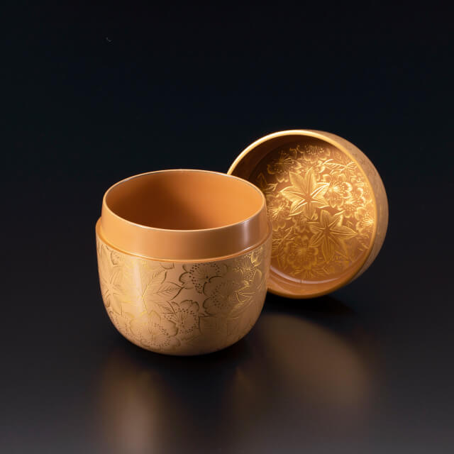 After a long period of time from conception, Chubei's confident work, the 'three-tiered white lacquer carved jug,' was completed. The 'CHINKIN (gold inlay)' series began from there.