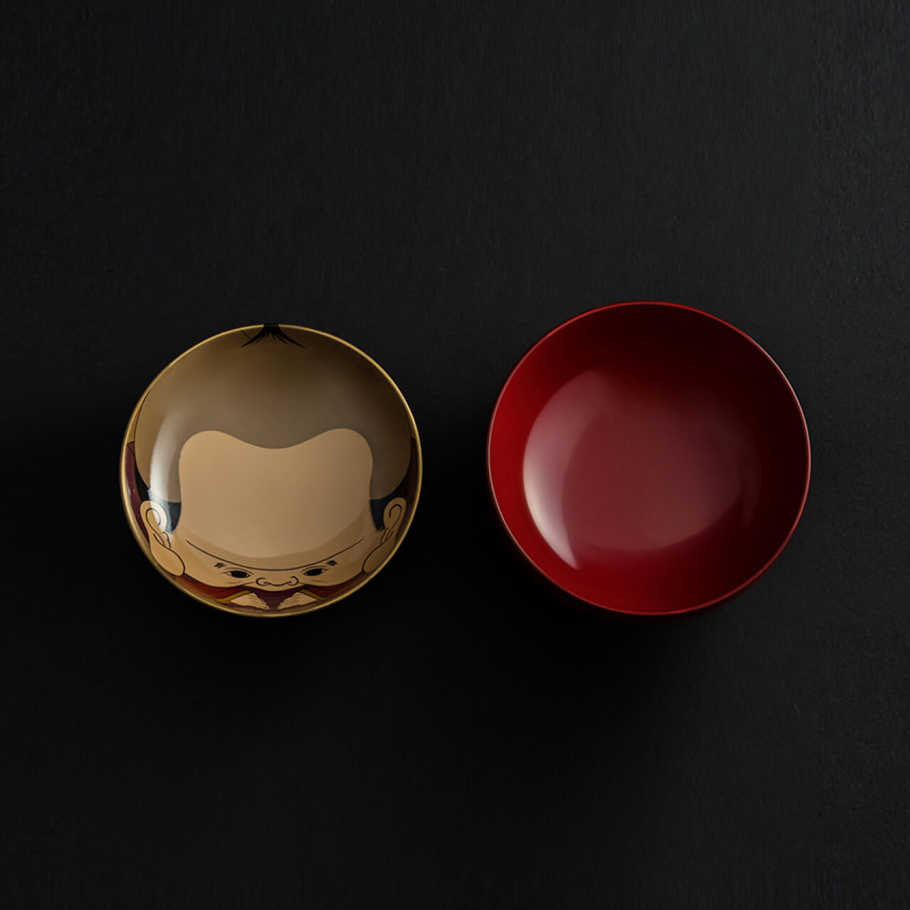 The bowl with Fukusuke drawn on it is lacquered in deep vermillion with a glossy finish.
