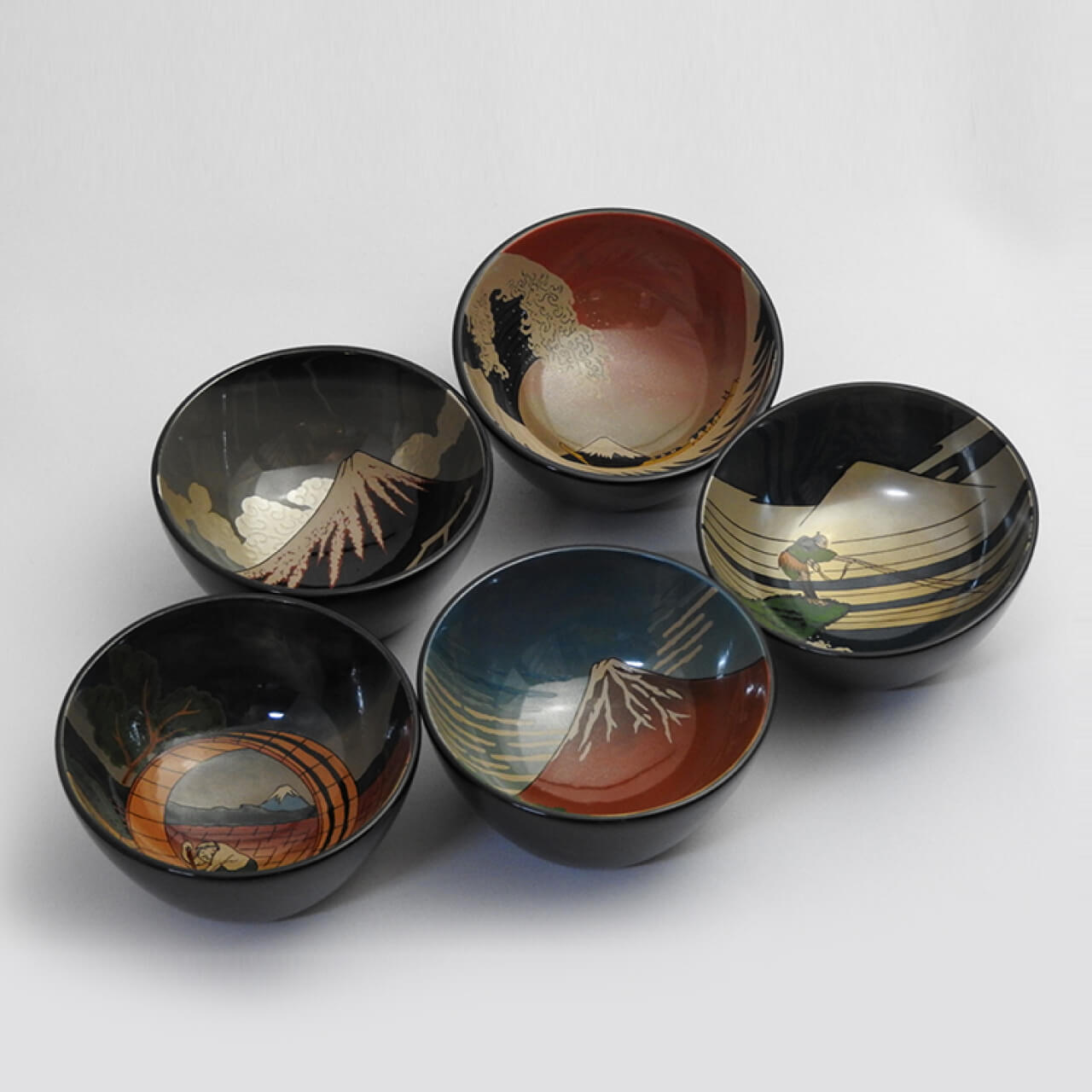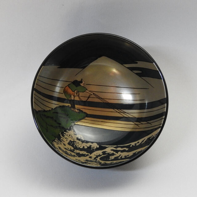 塗師が艶やかに塗り上げた器の曲面に、熟練の蒔絵師が描く浮世絵の世界。